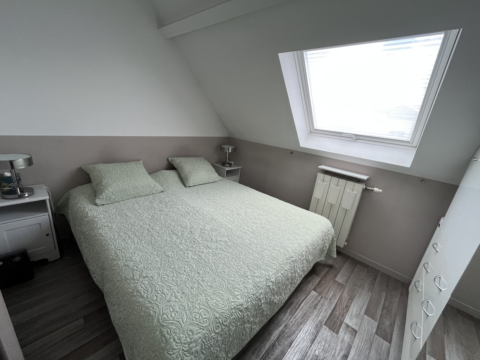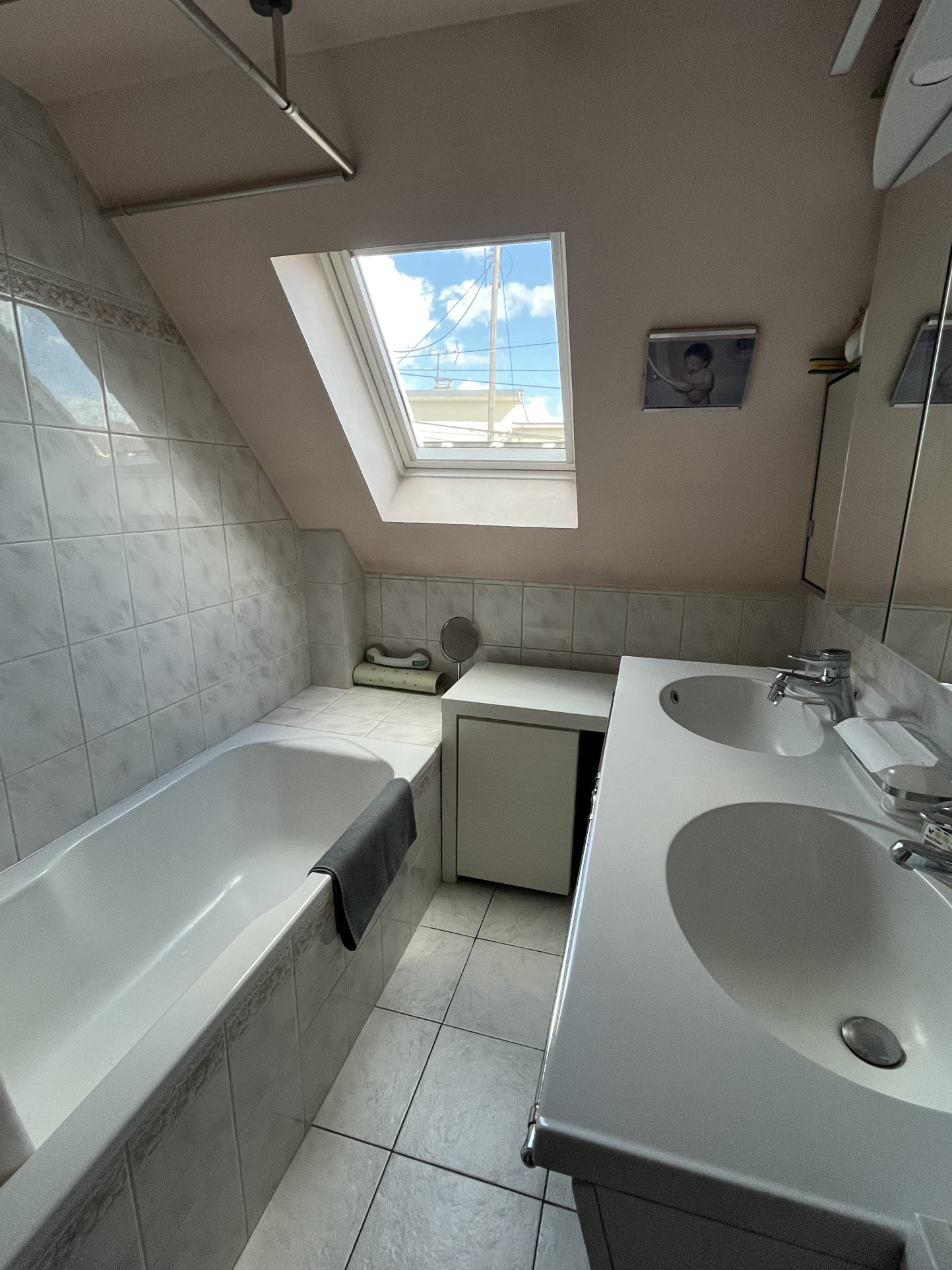 à l’étage un grand hall servant de salle de jeu pouvant devenir une chambre, une salle de bains, un wc, un accès à un grenier au dessus du garage attenant, un sous sol partiel avec une pièce type cave-cellier.