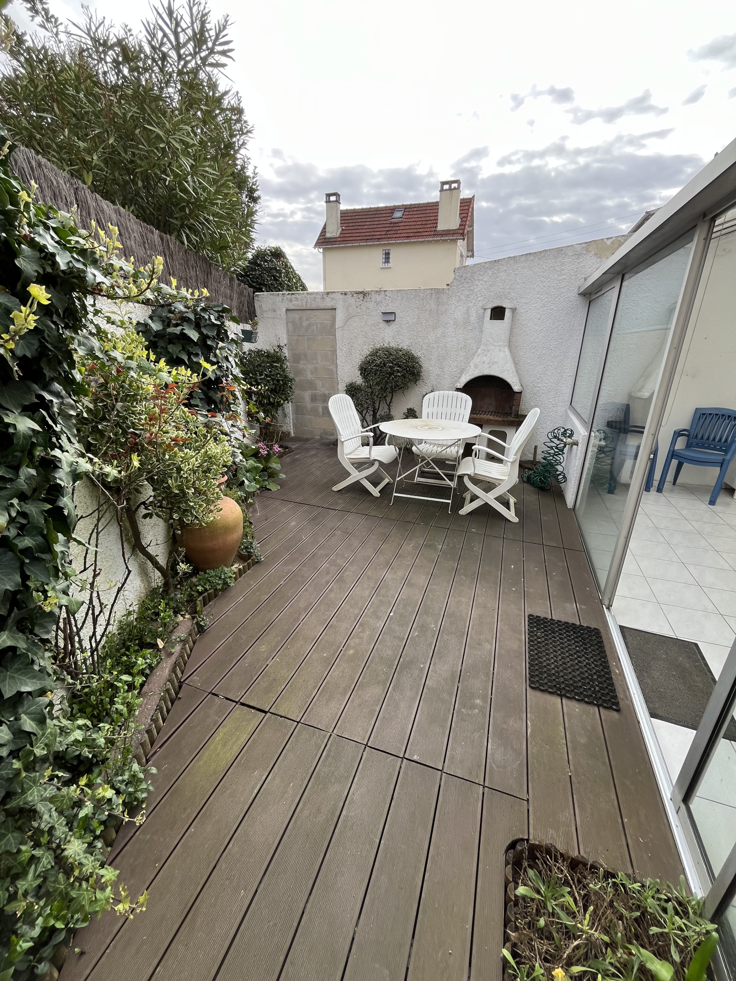 à l'extérieur un jardin derrière, une terrasse et sa véranda et devant un jardinet avec un abris à poubelles.