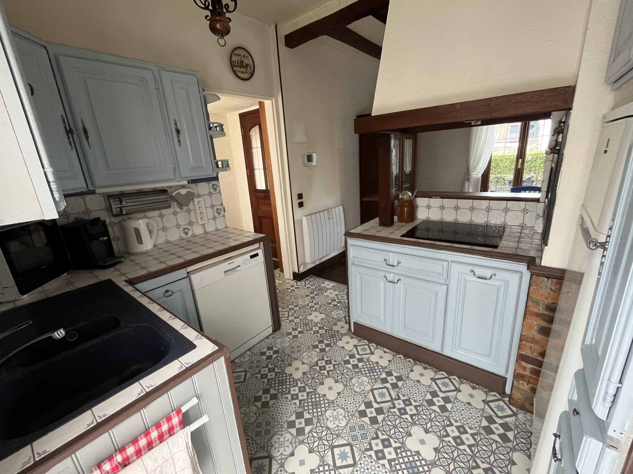 avec l'entrée sous petit hall, une cuisine américaine donnant sur une véranda (avec un coin aménagée en buanderie) et la salle à manger, un salon avec espace bureau ou coin nuit, une salle d'eau avec son toilette,