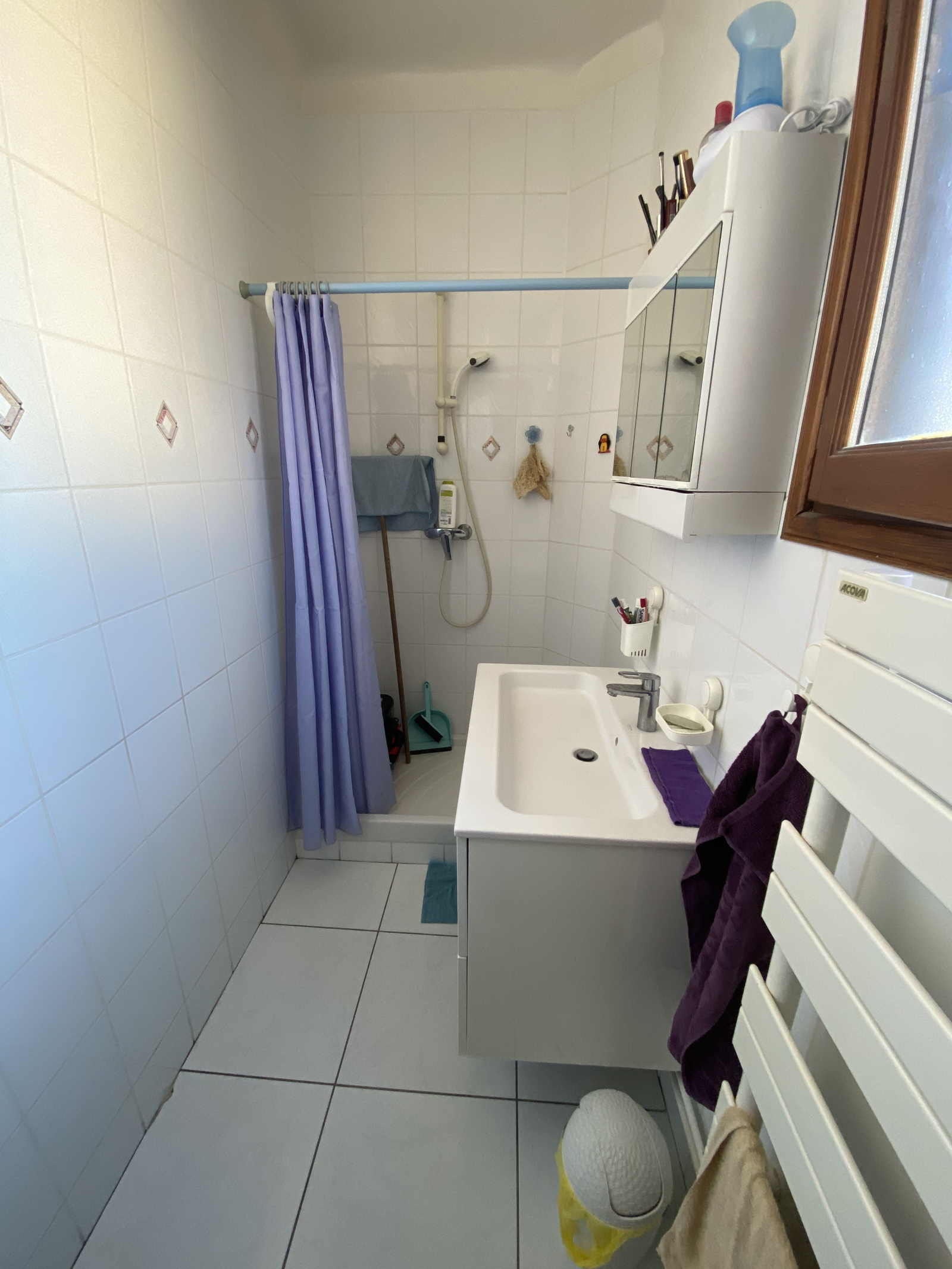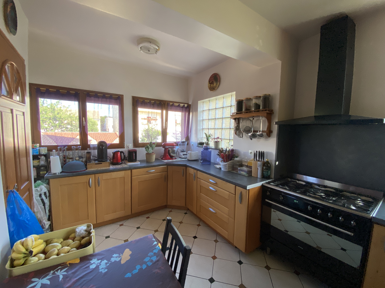 l'entrée se fait dans un hall avec rangements au rez de chaussée surélevé, un séjour double, une grande cuisine équipée avec accès au jardin, une salle d'eau, un wc,