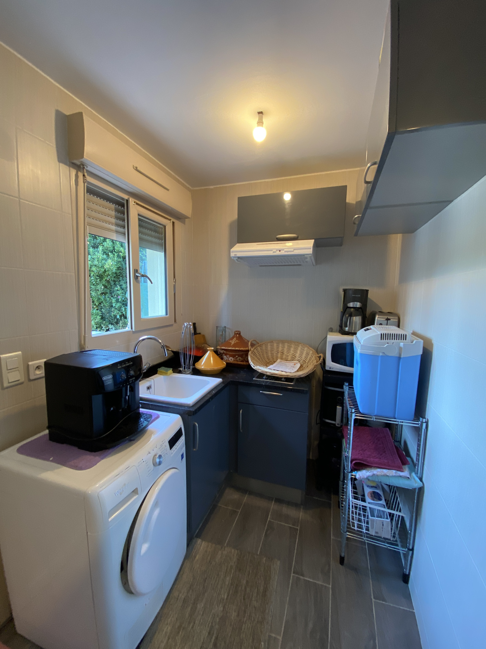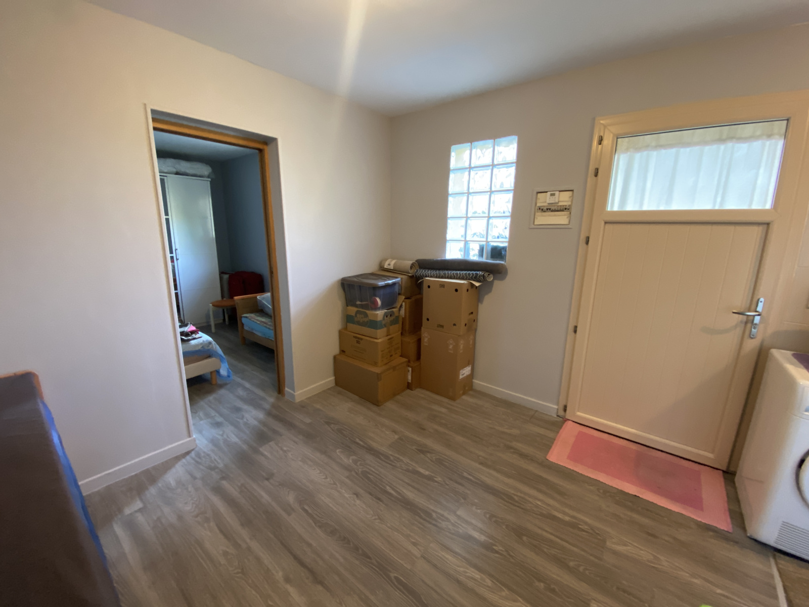 à l'extérieur un jardin avec un emplacement pour vos voitures côté rue, du jardin tout autour et une dépendance entièrement refaite toute équipée en appartement type F2 au fond de la parcelle d'environ 30m².